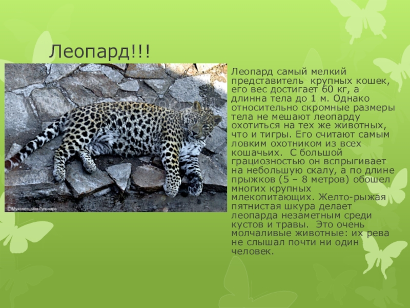 а длинна тела до 1 м. Однако относительно скромные размеры тела не мешают леопарду охотиться на тех же животных, что и тигры. Его считают самым ловким охотником из всех кошачьих. С большой грациозностью он вспрыгивает на небольшую скалу, а по длине прыжков (5 – 8 метров) обошел многих крупных млекопитающих. Желто-рыжая пятнистая шкура делает леопарда незаметным среди кустов и травы. Это очень молчаливые животные: их рева не слышал почти ни один человек.