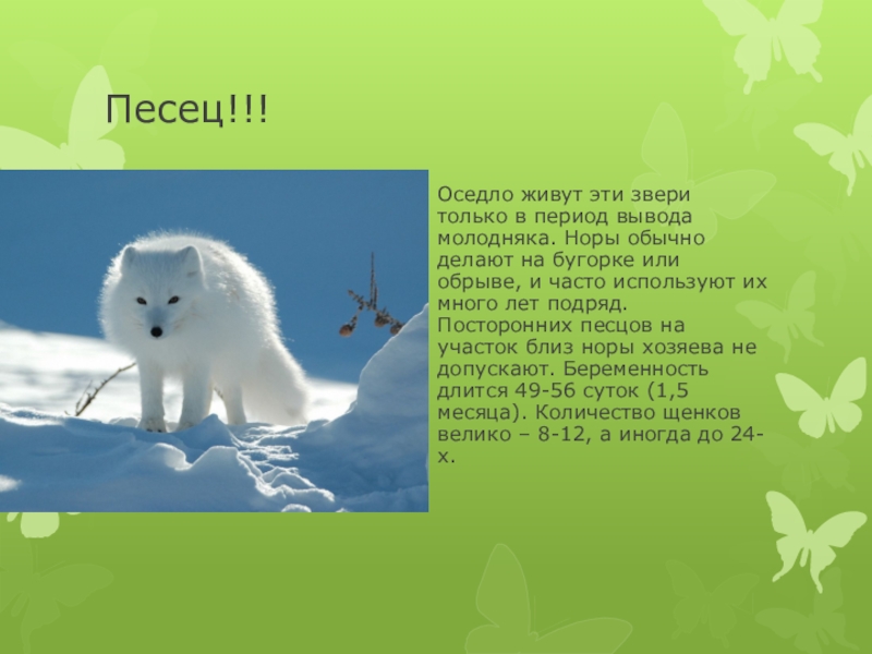 делают на бугорке или обрыве, и часто используют их много лет подряд. Посторонних песцов на участок близ норы хозяева не допускают. Беременность длится 49-56 суток (1,5 месяца). Количество щенков велико – 8-12, а иногда до 24-х.