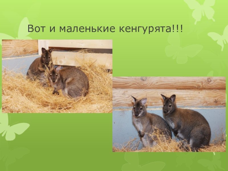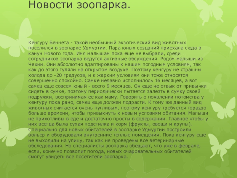 зоопарке Удмуртии. Пара юных созданий приехала сюда в канун Нового года. Имя малышам пока еще не выбрали, среди сотрудников зоопарка ведутся активные обсуждения. Родом малыши из Чехии. Они абсолютно адаптированы к нашим погодным условиям, так как до этого гуляли на открытом воздухе. Поэтому кенгуру не страшны холода до -20 градусов, и к жарким условиям они тоже относятся совершенно спокойно. Самке недавно исполнилось 16 месяцев, а вот самец еще совсем юный - всего 9 месяцев. Он еще не отвык от привычки сидеть в сумке, поэтому периодически пытается залезть в сумку своей подружки, воспринимая ее как маму. Говорить о появлении потомства у кенгуру пока рано, самец еще должен подрасти. К тому же данный вид животных считается очень пугливым, поэтому кенгуру требуется гораздо больше времени, чтобы привыкнуть к новым условиям обитания. Малыши не прихотливы в еде и достаточно просты в содержании. Главное чтобы у них всегда была сухая подстилка и корм (фрукты, овощи и крупы). Специально для новых обитателей в зоопарке Удмуртии построили вольер и оборудовали внутренние теплые помещения. Пока кенгуру еще не выходили на улицу, так как не проведены все ветеринарные обследования. Но специалисты зоопарка обещают, что уже в феврале, если, конечно позволит погода, новых очаровательных обитателей смогут увидеть все посетители зоопарка.