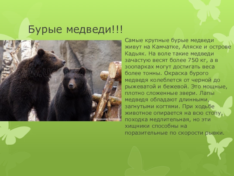 Кадьяк. На воле такие медведи зачастую весят более 750 кг, а в зоопарках могут достигать веса более тонны. Окраска бурого медведя колеблется от черной до рыжеватой и бежевой. Это мощные, плотно сложенные звери. Лапы медведя обладают длинными, загнутыми когтями. При ходьбе животное опирается на всю стопу, походка медлительная, но эти хищники способны на поразительные по скорости рывки.