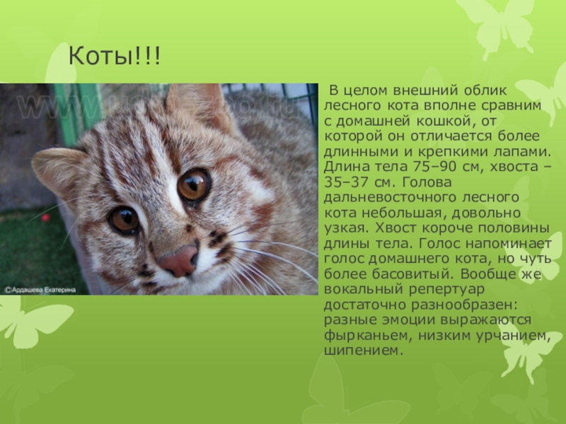 кошкой, от которой он отличается более длинными и крепкими лапами. Длина тела 75–90 см, хвоста – 35–37 см. Голова дальневосточного лесного кота небольшая, довольно узкая. Хвост короче половины длины тела. Голос напоминает голос домашнего кота, но чуть более басовитый. Вообще же вокальный репертуар достаточно разнообразен: разные эмоции выражаются фырканьем, низким урчанием, шипением.