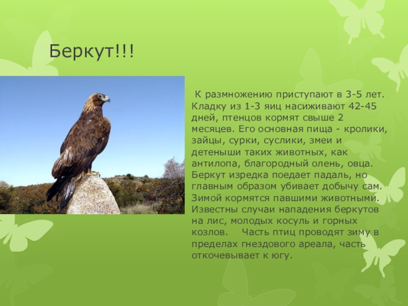 насиживают 42-45 дней, птенцов кормят свыше 2 месяцев. Его основная пища - кролики, зайцы, сурки, суслики, змеи и детеныши таких животных, как антилопа, благородный олень, овца. Беркут изредка поедает падаль, но главным образом убивает добычу сам. Зимой кормятся павшими животными. Известны случаи нападения беркутов на лис, молодых косуль и горных козлов. Часть птиц проводят зиму в пределах гнездового ареала, часть откочевывает к югу.