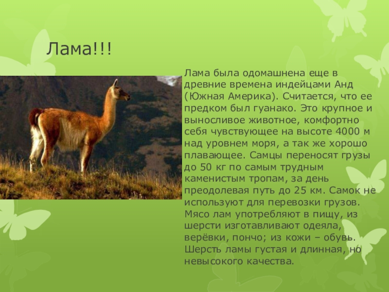 Считается, что ее предком был гуанако. Это крупное и выносливое животное, комфортно себя чувствующее на высоте 4000 м над уровнем моря, а так же хорошо плавающее. Самцы переносят грузы до 50 кг по самым трудным каменистым тропам, за день преодолевая путь до 25 км. Самок не используют для перевозки грузов. Мясо лам употребляют в пищу, из шерсти изготавливают одеяла, верёвки, пончо; из кожи – обувь. Шерсть ламы густая и длинная, но невысокого качества.