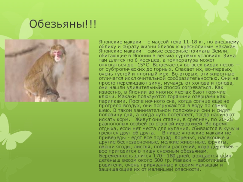 и образу жизни близок к краснолицым макакам. Японские макаки – самые северные приматы Земли, обитающие в Японии в весьма суровых условиях. Зима там длится по 6 месяцев, а температура может опускаться до -15°С. Встречается во всех видах лесов — от субтропических до горных. Спасает их, во-первых, очень густой и плотный мех. Во-вторых, эти животные отличатся исключительной сообразительностью. Они не просто пережидают зиму, мучаясь от холода и голода, они нашли удивительный способ согреваться. Как известно, в Японии во многих местах бьют горячие ключи. Макаки пользуются горячими озерцами как парилками. После ночного сна, когда солнце еще не прогрело воздух, они погружаются в воду по самую шею. В таком занимательном положении они и сидят половину дня, а когда чуть потеплеет, тогда начинают искать корм. Живут они стаями, в среднем, по 20-25 разнополых особей со строгой иерархией. Во время отдыха, если нет места для купания, сбиваются в кучу и греются друг об друга. В пище японские макаки не привереды - едят все подряд. Коренья, насекомые и другие беспозвоночные, мелкие животные, фрукты, овощи ягоды, листья, побеги растений, кора деревьев – все пригодится в пищу снежным обезьянам. Беременность длится 170—180 дней, рождается один детёныш весом около 500 гр. Макаки – заботливые родители, очень привязанные к своим малышам и защищающие их от малейшей опасности.
