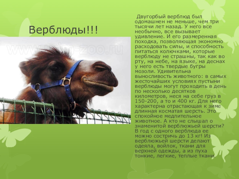 назад. У него все необычно, все вызывает удивление. И его размеренная походка, позволяющая экономно расходовать силы, и способность питаться колючками, которые верблюду не страшны, так как во рту, на небе, на языке, на деснах у него есть твердые бугры мозоли. Удивительна выносливость животного: в самых жесточайших условиях пустыни верблюды могут проходить в день по несколько десятков километров, неся на себе груз в 150-200, а то и 400 кг. Для него характерна отрастающая к зиме длинная косматая шерсть. Это спокойное медлительное животное. А кто не слышал о знаменитой верблюжьей шерсти? В год с одного верблюда ее можно состричь до 13 кг! Из верблюжьей шерсти делают одеяла, войлок, ткани для верхней одежды, а из пуха тонкие, легкие, теплые ткани.