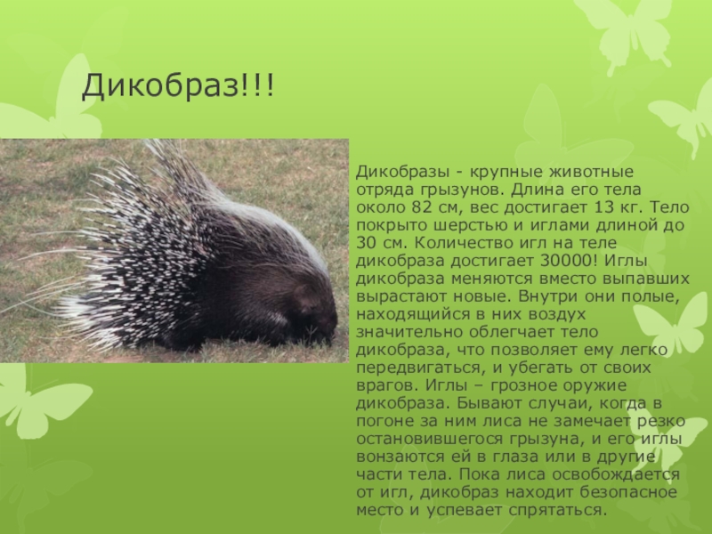 см, вес достигает 13 кг. Тело покрыто шерстью и иглами длиной до 30 см. Количество игл на теле дикобраза достигает 30000! Иглы дикобраза меняются вместо выпавших вырастают новые. Внутри они полые, находящийся в них воздух значительно облегчает тело дикобраза, что позволяет ему легко передвигаться, и убегать от своих врагов. Иглы – грозное оружие дикобраза. Бывают случаи, когда в погоне за ним лиса не замечает резко остановившегося грызуна, и его иглы вонзаются ей в глаза или в другие части тела. Пока лиса освобождается от игл, дикобраз находит безопасное место и успевает спрятаться.