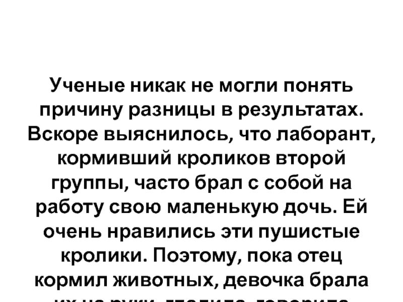что лаборант, кормивший кроликов второй группы, часто брал с собой на работу свою маленькую дочь. Ей очень нравились эти пушистые кролики. Поэтому, пока отец кормил животных, девочка брала их на руки, гладила, говорила ласковые слова.