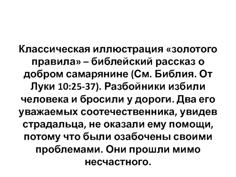 Слайд 31Классическая иллюстрация «золотого правила» – библейский рассказ о добром самарянине (См.