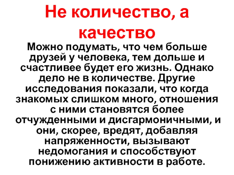 тем дольше и счастливее будет его жизнь. Однако дело не в количестве. Другие исследования показали, что когда знакомых слишком много, отношения с ними становятся более отчужденными и дисгармоничными, и они, скорее, вредят, добавляя напряженности, вызывают недомогания и способствуют понижению активности в работе.