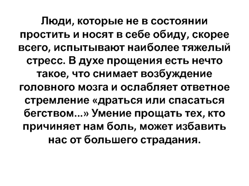скорее всего, испытывают наиболее тяжелый стресс. В духе прощения есть нечто такое, что снимает возбуждение головного мозга и ослабляет ответное стремление «драться или спасаться бегством...» Умение прощать тех, кто причиняет нам боль, может избавить нас от большего страдания.