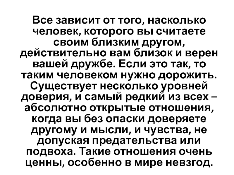 другом, действительно вам близок и верен вашей дружбе. Если это так, то таким человеком нужно дорожить. Существует несколько уровней доверия, и самый редкий из всех – абсолютно открытые отношения, когда вы без опаски доверяете другому и мысли, и чувства, не допуская предательства или подвоха. Такие отношения очень ценны, особенно в мире невзгод.