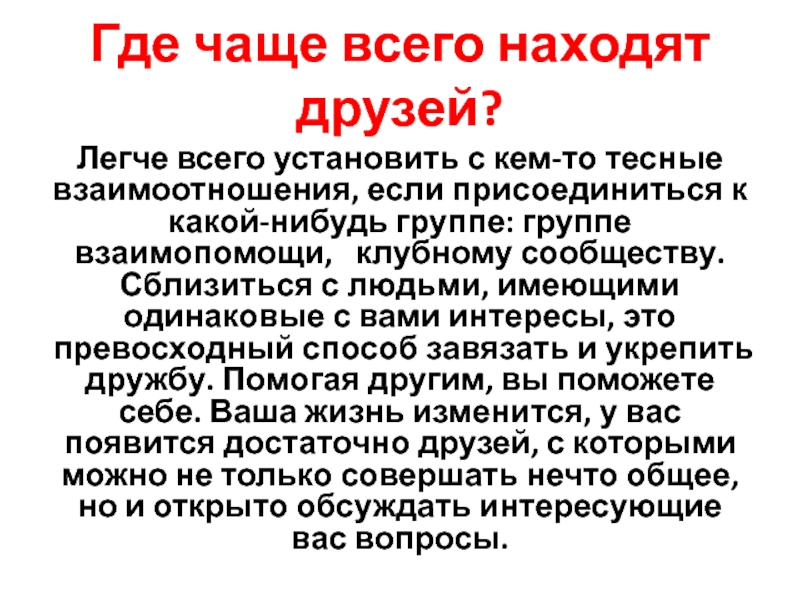 если присоединиться к какой-нибудь группе: группе взаимопомощи, клубному сообществу. Сблизиться с людьми, имеющими одинаковые с вами интересы, это превосходный способ завязать и укрепить дружбу. Помогая другим, вы поможете себе. Ваша жизнь изменится, у вас появится достаточно друзей, с которыми можно не только совершать нечто общее, но и открыто обсуждать интересующие вас вопросы.