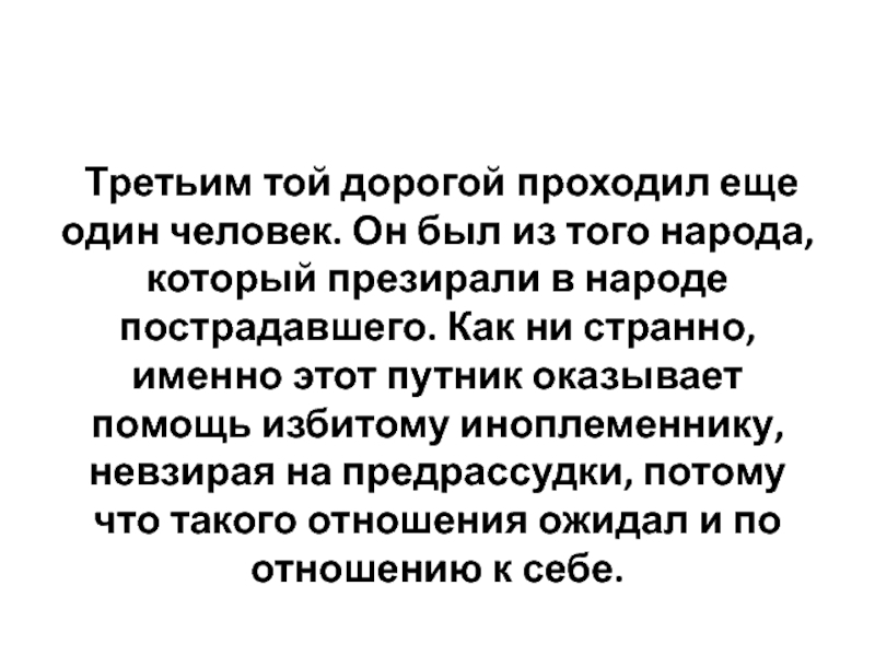 того народа, который презирали в народе пострадавшего. Как ни странно, именно этот путник оказывает помощь избитому иноплеменнику, невзирая на предрассудки, потому что такого отношения ожидал и по отношению к себе.