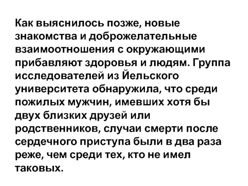 здоровья и людям. Группа исследователей из Йельского университета обнаружила, что среди пожилых мужчин, имевших хотя бы двух близких друзей или родственников, случаи смерти после сердечного приступа были в два раза реже, чем среди тех, кто не имел таковых.