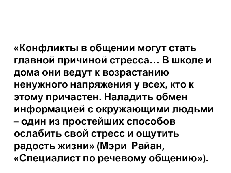 дома они ведут к возрастанию ненужного напряжения у всех, кто к этому причастен. Наладить обмен информацией с окружающими людьми – один из простейших способов ослабить свой стресс и ощутить радость жизни» (Мэри Райан, «Специалист по речевому общению»).