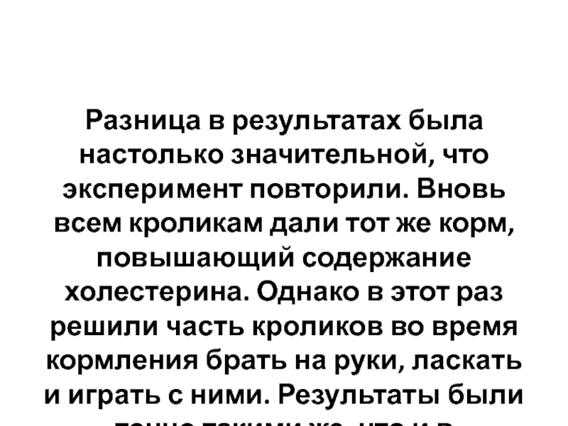 кроликам дали тот же корм, повышающий содержание холестерина. Однако в этот раз решили часть кроликов во время кормления брать на руки, ласкать и играть с ними. Результаты были точно такими же, что и в предыдущем случае.