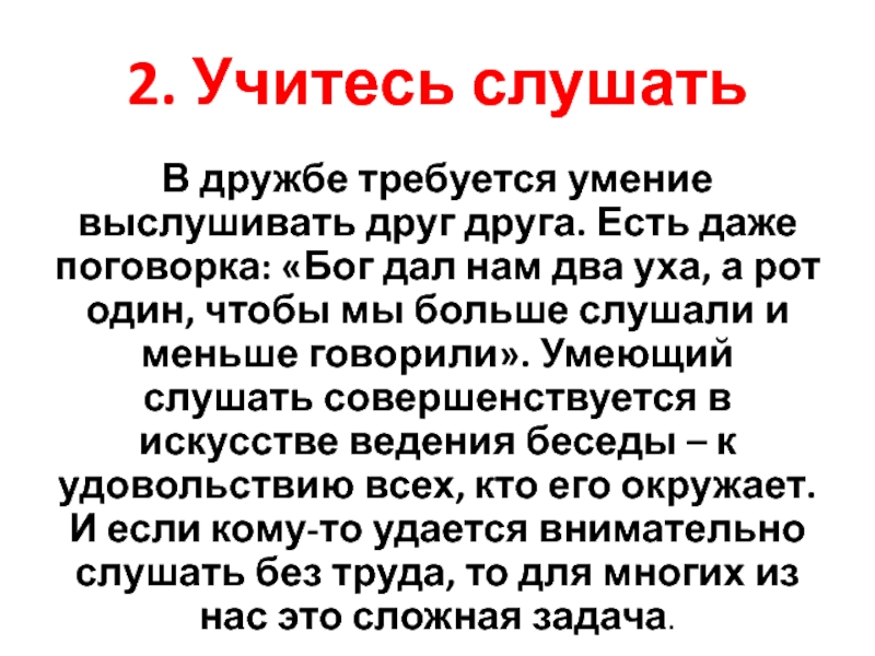 поговорка: «Бог дал нам два уха, а рот один, чтобы мы больше слушали и меньше говорили». Умеющий слушать совершенствуется в искусстве ведения беседы – к удовольствию всех, кто его окружает. И если кому-то удается внимательно слушать без труда, то для многих из нас это сложная задача.