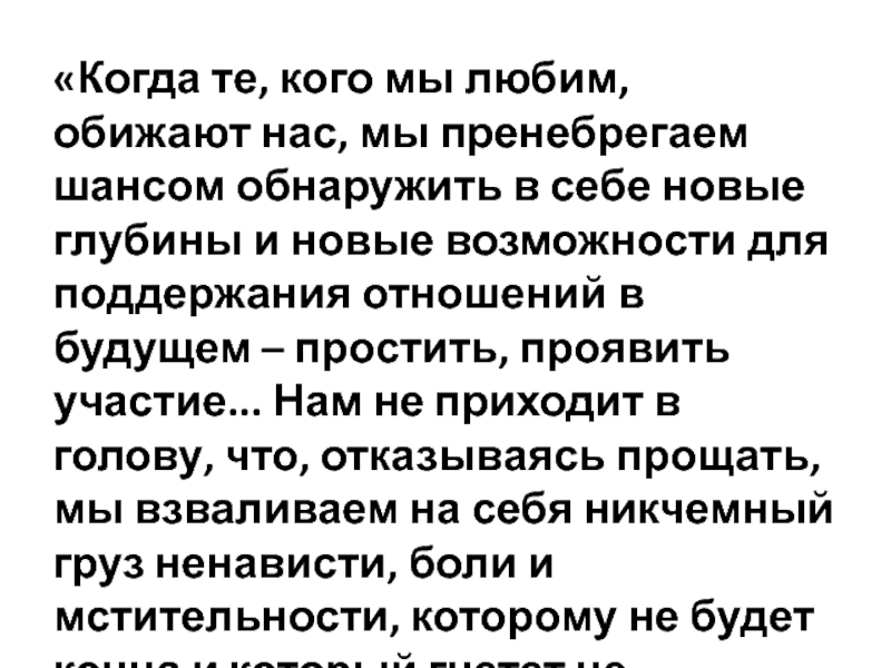 в себе новые глубины и новые возможности для поддержания отношений в будущем – простить, проявить участие... Нам не приходит в голову, что, отказываясь прощать, мы взваливаем на себя никчемный груз ненависти, боли и мстительности, которому не будет конца и который гнетет не обидчика, а нас».