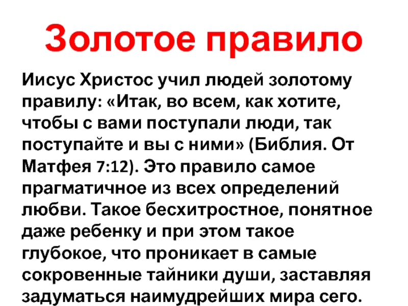 хотите, чтобы с вами поступали люди, так поступайте и вы с ними» (Библия. От Матфея 7:12). Это правило самое прагматичное из всех определений любви. Такое бесхитростное, понятное даже ребенку и при этом такое глубокое, что проникает в самые сокровенные тайники души, заставляя задуматься наимудрейших мира сего.