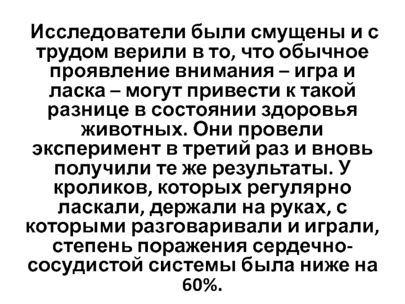 обычное проявление внимания – игра и ласка – могут привести к такой разнице в состоянии здоровья животных. Они провели эксперимент в третий раз и вновь получили те же результаты. У кроликов, которых регулярно ласкали, держали на руках, с которыми разговаривали и играли, степень поражения сердечно-сосудистой системы была ниже на 60%.