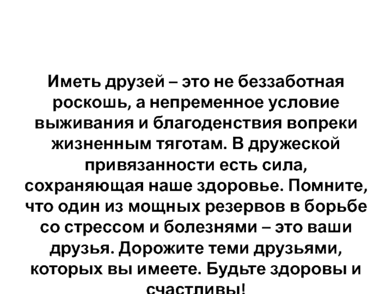 и благоденствия вопреки жизненным тяготам. В дружеской привязанности есть сила, сохраняющая наше здоровье. Помните, что один из мощных резервов в борьбе со стрессом и болезнями – это ваши друзья. Дорожите теми друзьями, которых вы имеете. Будьте здоровы и счастливы!
