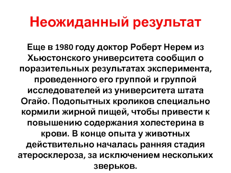 сообщил о поразительных результатах эксперимента, проведенного его группой и группой исследователей из университета штата Огайо. Подопытных кроликов специально кормили жирной пищей, чтобы привести к повышению содержания холестерина в крови. В конце опыта у животных действительно началась ранняя стадия атеросклероза, за исключением нескольких зверьков.
