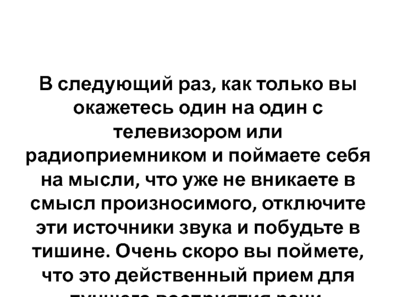 телевизором или радиоприемником и поймаете себя на мысли, что уже не вникаете в смысл произносимого, отключите эти источники звука и побудьте в тишине. Очень скоро вы поймете, что это действенный прием для лучшего восприятия речи.