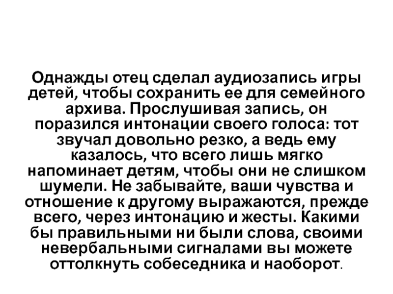 архива. Прослушивая запись, он поразился интонации своего голоса: тот звучал довольно резко, а ведь ему казалось, что всего лишь мягко напоминает детям, чтобы они не слишком шумели. Не забывайте, ваши чувства и отношение к другому выражаются, прежде всего, через интонацию и жесты. Какими бы правильными ни были слова, своими невербальными сигналами вы можете оттолкнуть собеседника и наоборот.