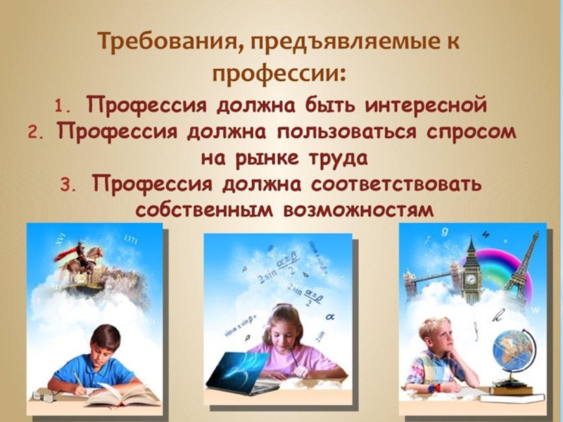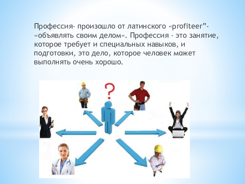 Профессия- произошло от латинского «profiteer”-«объявлять своим делом». Профессия - это занятие, которое требует и специальных навыков, и подготовки, это дело, которое человек может выполнять очень хорошо.