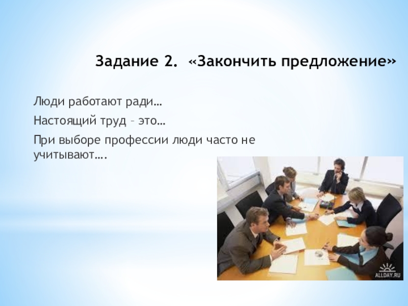 Задание 2.  «Закончить предложение» Люди работают ради…Настоящий труд – это…При выборе профессии люди часто не учитывают….