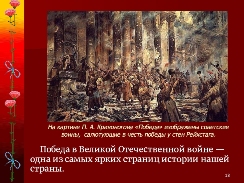 На картине П. А. Кривоногова «Победа» изображены советские воины, салютующие в честь победы у стен Рейхстага.
