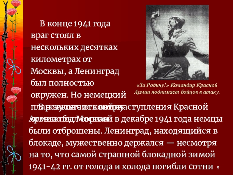 В конце 1941 года враг стоял в нескольких десятках километрах от Москвы, а Ленинград был полностью окружен. Но немецкий план закончить войну осенью был сорван.
