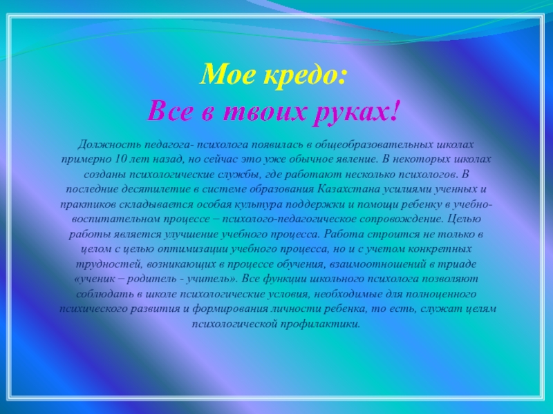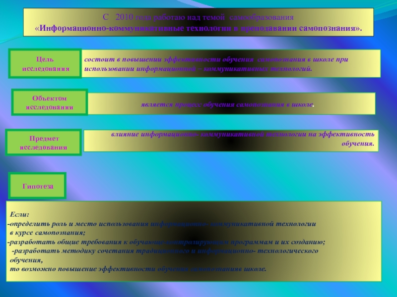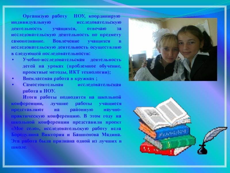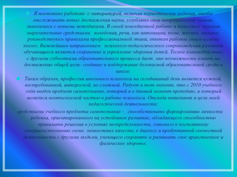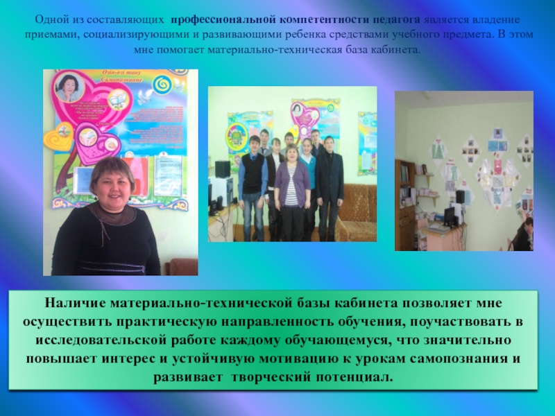 Наличие материально-технической базы кабинета позволяет мне осуществить практическую направленность обучения, поучаствовать в исследовательской работе каждому обучающемуся, что значительно повышает интерес и устойчивую мотивацию к урокам самопознания и развивает творческий потенциал.