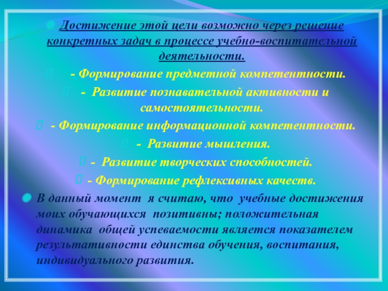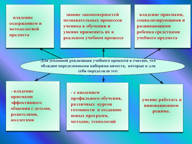 - знание закономерностей познавательных процессов ученика в обучении и умение применять их в реальном учебном процессе