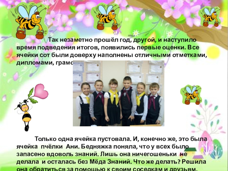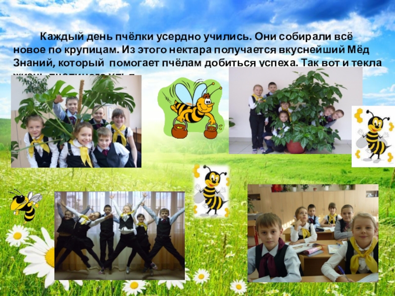 Они собирали всё новое по крупицам. Из этого нектара получается вкуснейший Мёд Знаний, который помогает пчёлам добиться успеха. Так вот и текла жизнь пчелиного улья.