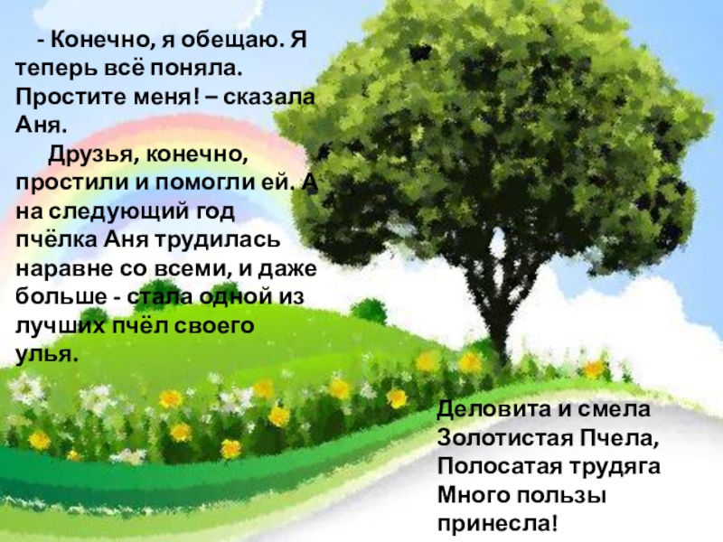 Друзья, конечно, простили и помогли ей. А на следующий год пчёлка Аня трудилась наравне со всеми, и даже больше - стала одной из лучших пчёл своего улья.