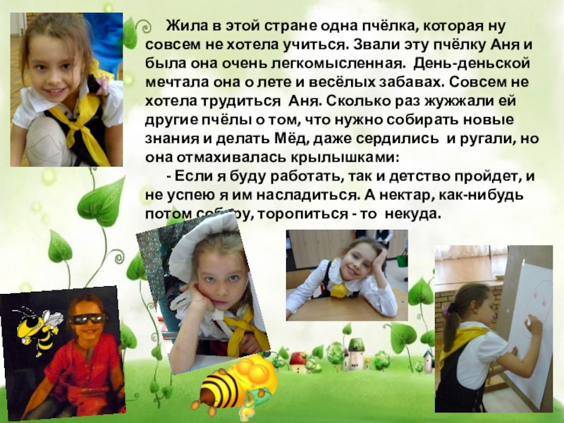 совсем не хотела учиться. Звали эту пчёлку Аня и была она очень легкомысленная. День-деньской мечтала она о лете и весёлых забавах. Совсем не хотела трудиться Аня. Сколько раз жужжали ей другие пчёлы о том, что нужно собирать новые знания и делать Мёд, даже сердились и ругали, но она отмахивалась крылышками:
