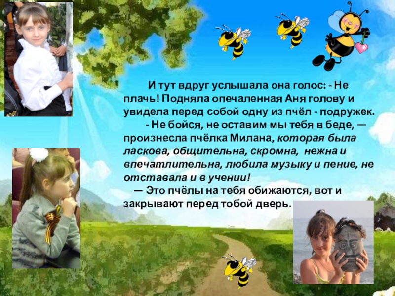 - Не бойся, не оставим мы тебя в беде, — произнесла пчёлка Милана, которая была ласкова, общительна, скромна, нежна и впечатлительна, любила музыку и пение, не отставала и в учении!