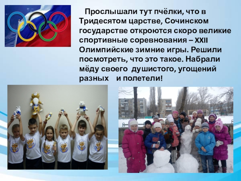 откроются скоро великие спортивные соревнования – XXII Олимпийские зимние игры. Решили посмотреть, что это такое. Набрали мёду своего душистого, угощений разных и полетели!