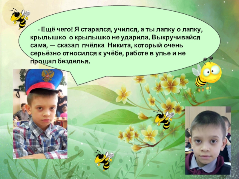 лапку о лапку, крылышко о крылышко не ударила. Выкручивайся сама, — сказал пчёлка Никита, который очень серьёзно относился к учёбе, работе в улье и не прощал безделья.