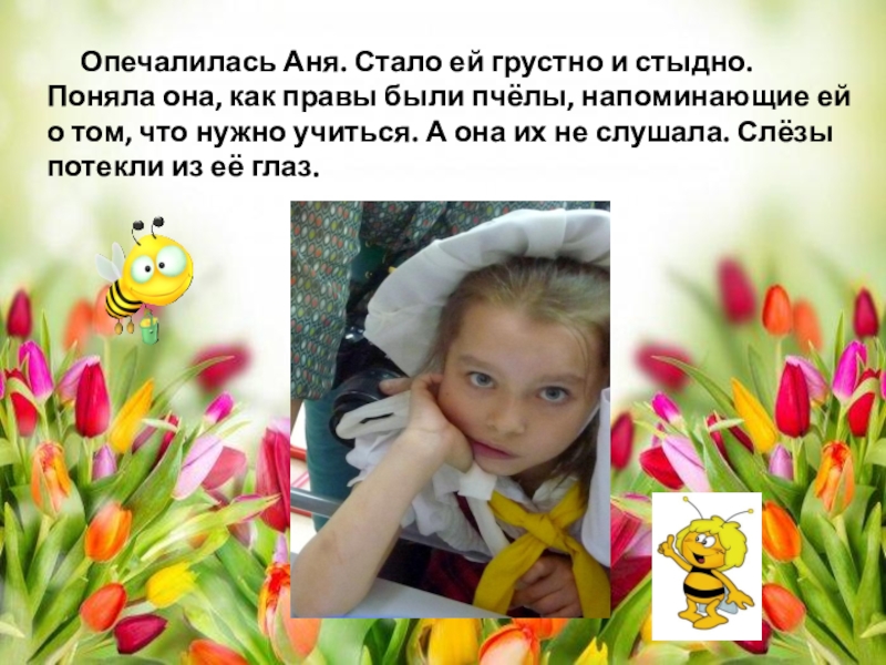 Слайд 10 Опечалилась Аня. Стало ей грустно и стыдно. Поняла