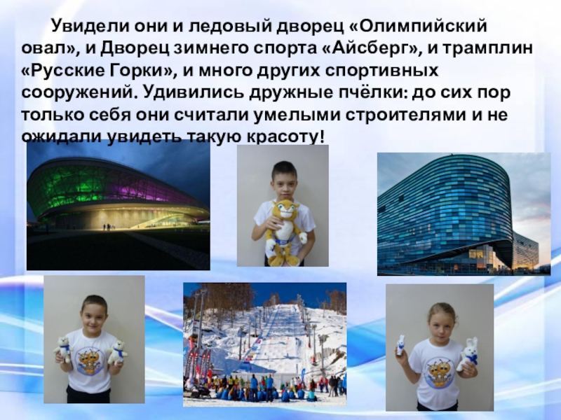 и Дворец зимнего спорта «Айсберг», и трамплин «Русские Горки», и много других спортивных сооружений. Удивились дружные пчёлки: до сих пор только себя они считали умелыми строителями и не ожидали увидеть такую красоту!