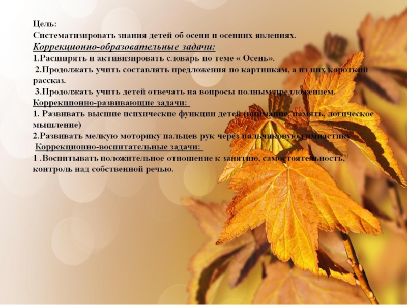 Презентация к конспекту подгруппового занятия по формированию лексико-грамматических средств языка в группе компенсирующей направленности ЗПР тема Осень Педагогика
