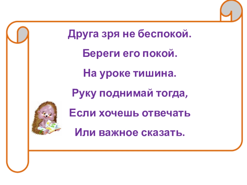 Друга зря не беспокой.Береги его покой.На уроке тишина. Руку поднимай тогда,Если хочешь отвечатьИли важное сказать.