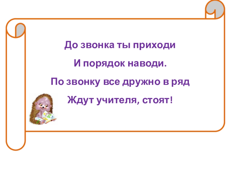 До звонка ты приходиИ порядок наводи.По звонку все дружно в рядЖдут учителя, стоят!