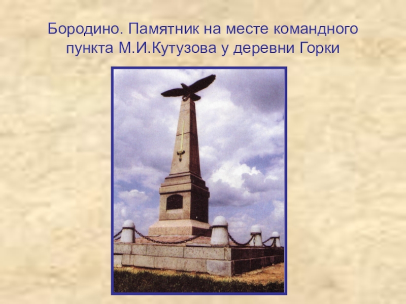 Слайд 26Бородино. Памятник на месте командного пункта М.И.Кутузова у деревни Горки