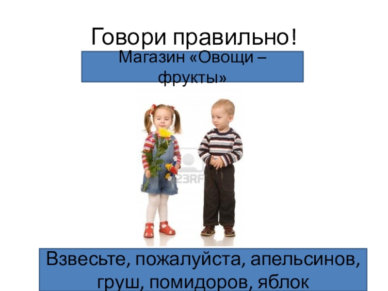 Говори правильно!Магазин «Овощи – фрукты»Взвесьте, пожалуйста, апельсинов, груш, помидоров, яблок