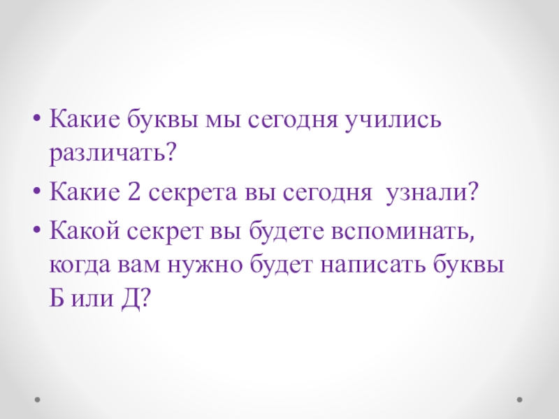 Какие буквы мы сегодня учились различать?Какие 2 секрета вы сегодня узнали?Какой секрет вы будете вспоминать, когда вам