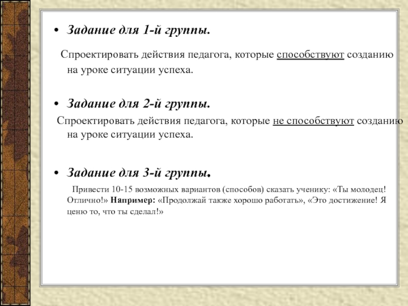 проектирование позитивных программ действий для создания ситуаций успеха на уроке;