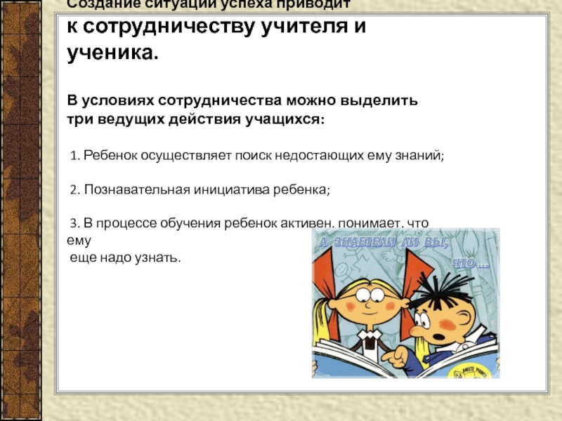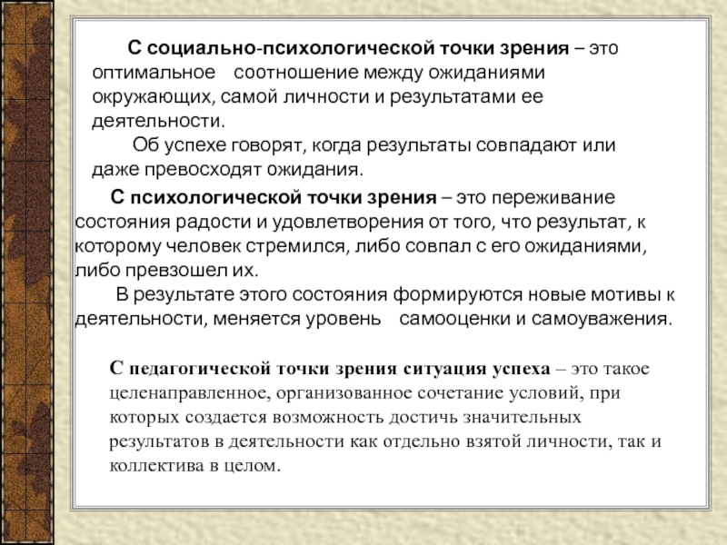 С педагогической точки зрения ситуация успеха – это такое целенаправленное, организованное сочетание условий, при которых создается возможность достичь значительных результатов в деятельности как отдельно взятой личности, так и коллектива в целом.